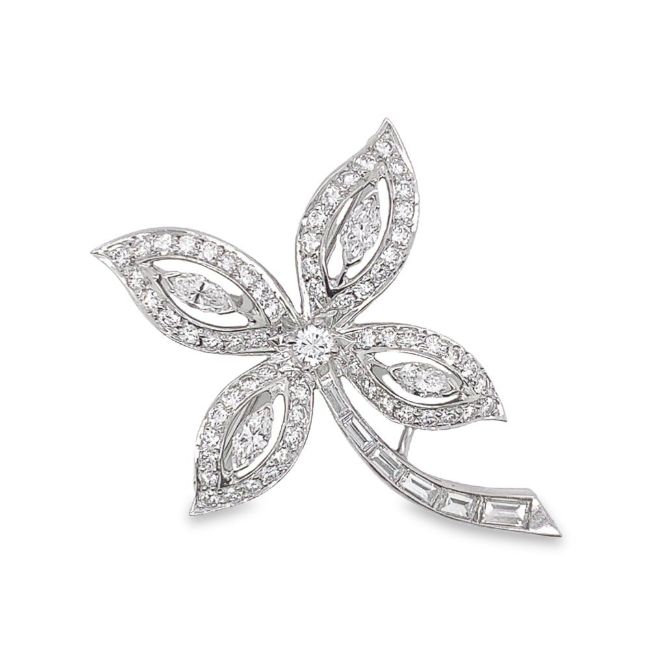 Four marquise diamonds (0.68ct total weight) in each leaf surrounded by round brilliant cut diamonds