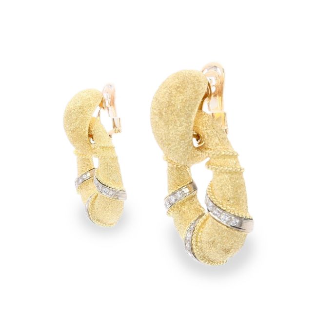6 (3 per earring) stations of 36 (18 per earring) round brilliant cut diamonds (0.75ct total weight)