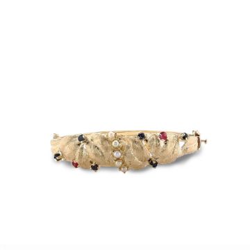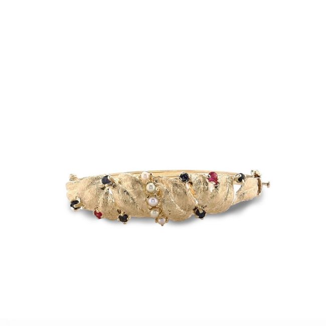 Gemstones: 5 cultured pearls, 6 round sapphires, 2 round ruby chips