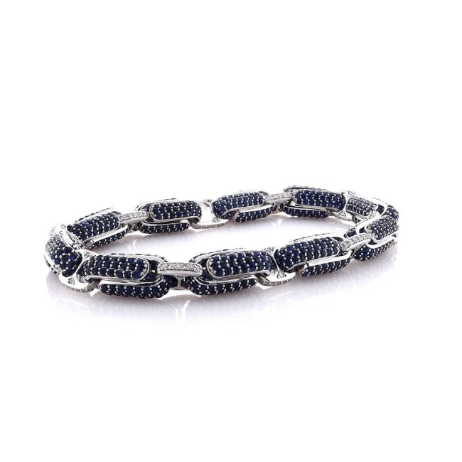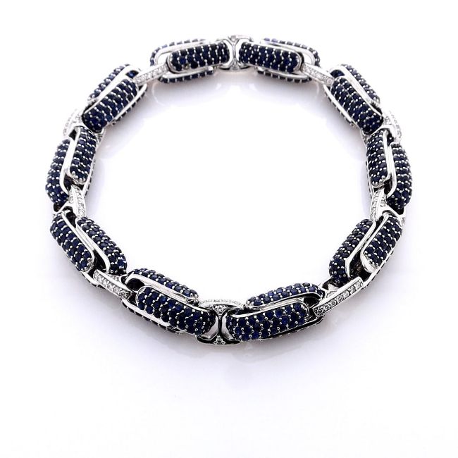 Metal Type: 14k White GoldSetting Type: PaveFinish: High PolishStyle: Link Style Gemstone BraceletStones: 9 Blue Pave Sapphire Links, 21.80ct Total WeightDiamonds: 10 Alternating Diamond Bars,?1.71ct Total WeightSmyth SKU:?43162916