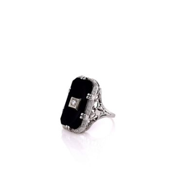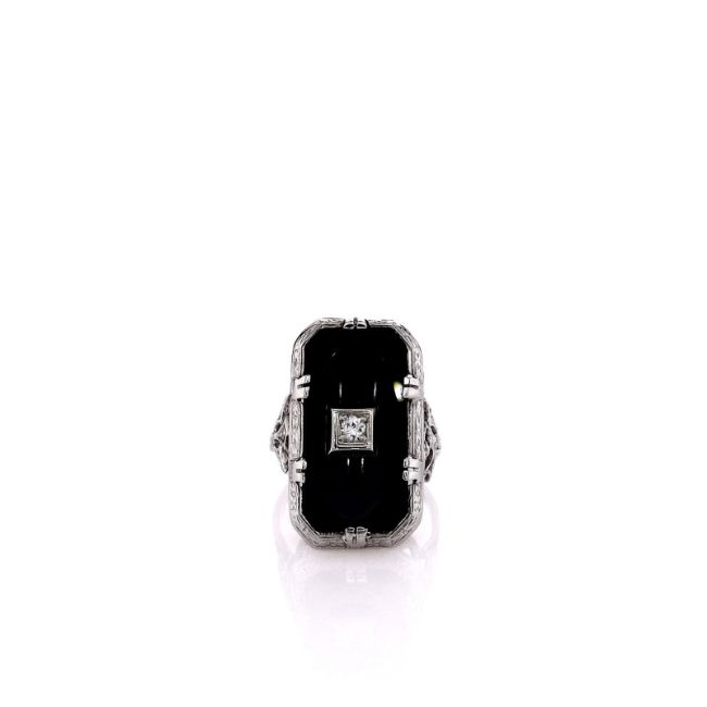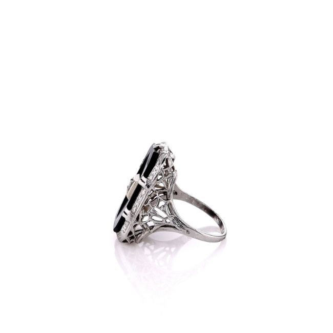 Metal Type: 18k White GoldSetting Type: Bead-Set Diamond and Prong-Set OnyxFinish: High PolishRing Size: 6.25Width: 22.6mm x 13.2mm Center, 3.0mm Band Tapering to 1.3mmDiamond: 1 Round Brilliant Cut Center Diamond, 0.06ct Total WeightDiamond Quality: H Color, SI1 ClarityStones: One 20 x 10mm OnyxSmyth SKU: 4230834-21