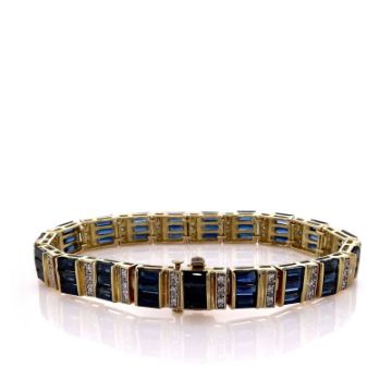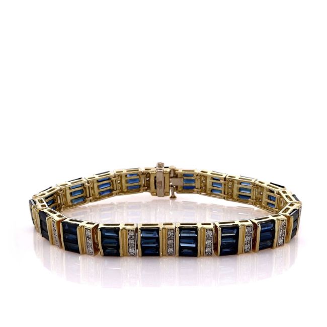 Metal Type: 18 Karat Yellow GoldSetting Type: Pave Diamonds, Channel-Set SapphiresFinish: High PolishWidth: 8.0mmLength: 6.75Diamonds: 57 Round Brilliant Cut Diamonds, 0.74ct Total WeightDiamond Quality: H Color, VS ClarityStones: 57 Baguette-Cut Blue Sapphires, 17.10ct Total WeightSome Chips On Sapphires NotedSmyth SKU:?BT-SM1000666-04