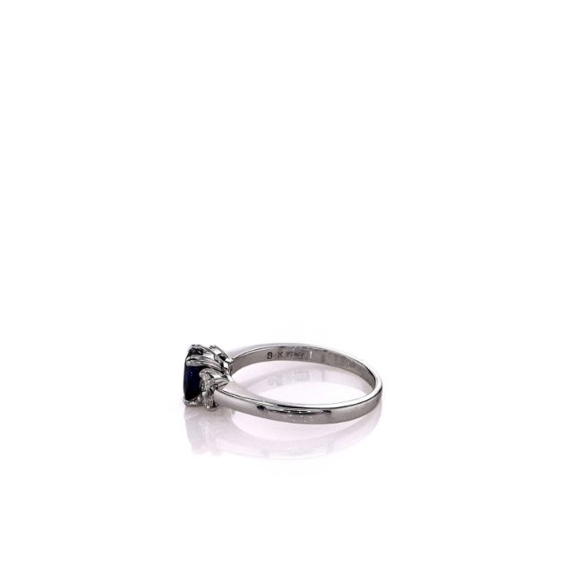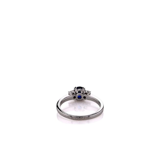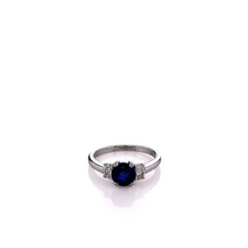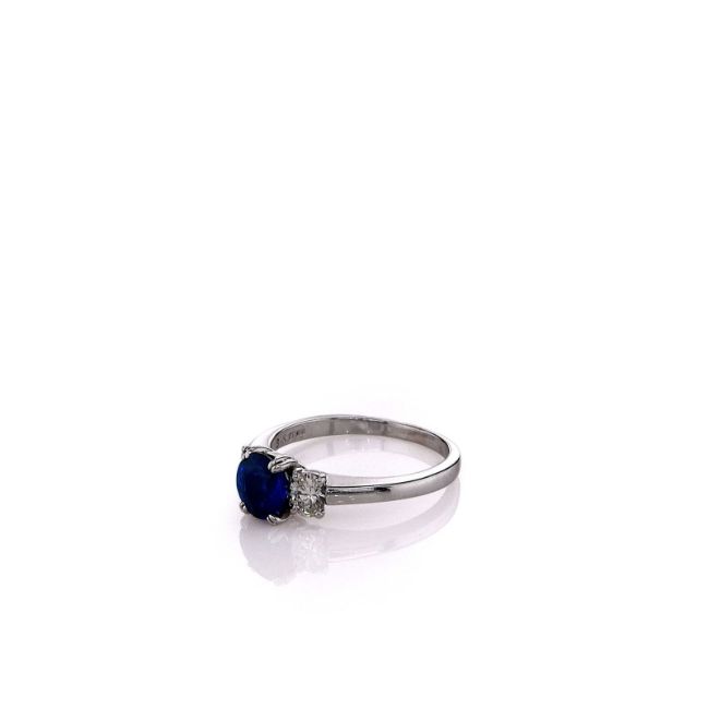 Metal Type: PlatinumSetting Type: Prong-SetFinish: high PolishWidth: 6.5mm Center, 2.0mm Shank Tapering To 1.7mmRing Size: 7.75Stones: 1 Round Blue Sapphire, 1.20ct Total WeightDiamonds: 2 Oval Cut Diamonds, 0.40ct Total WeightDiamond Quality: I Color, VS ClaritySmyth SKU: 24.1EC-102910B