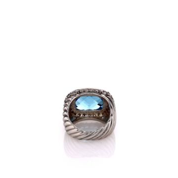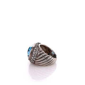 Metal Type: Sterling SilverSetting Type: Bezel-Set Topaz and Pave DiamondsFinish: High PolishWidth: 16.0mm Center, 11.5mm Shank Tapering To 5.0mmRing Size: 6Trademark: David YurmanStones: One 15.5mm x 11.5mm Faceted Blue Topaz?Diamonds: 45 Round Brilliant Cut Diamonds, 1.35ct Total WeightDiamond Quality: H Color, SI ClaritySmyth SKU: 3230109-9