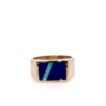 Metal Type: 14k Yellow GoldSetting Type: InlayFinish: High PolishWidth: 10.4mm Tapering To 4.0mmStones: 12mm x 8mm Lapis Inlay With Opal StripeRing Size: 10Smyth SKU: BT-SM1001303-07