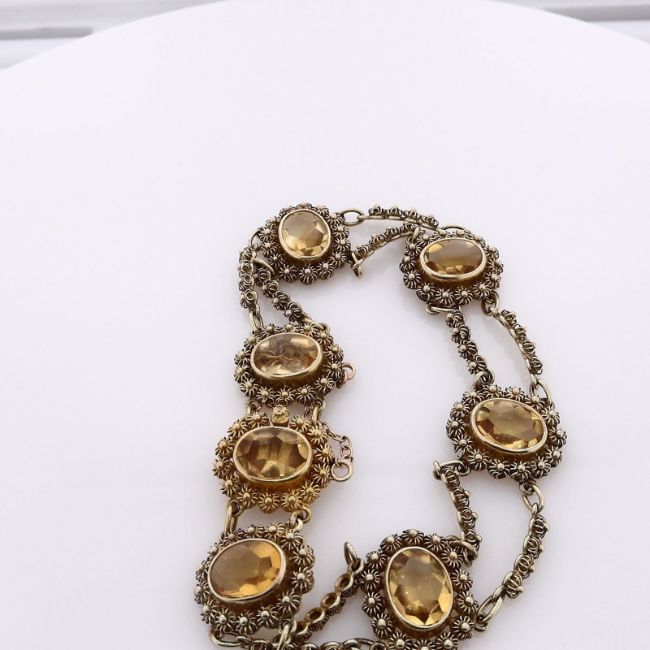 Metal Type: 14k Yellow GoldSetting Type: Bezel-SetFinish: High Polish and TexturedStones: 7 Yellow Oval Mixed Cut Citrine8.5mm x 6.5mm Beaded Ball Frame and LinksSafety ChainSmyth SKU: 4231361-35
