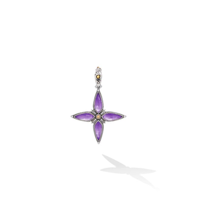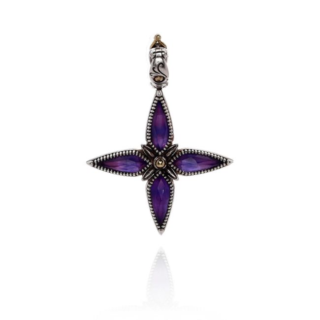 Metal Type: Sterling Silver and 18k Yellow GoldSetting Type: Bezel-SetFinish: High PolishTrademark: KonstantinoStones: 4 Purple AmethystsSmyth SKU: STKJ425-653