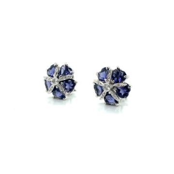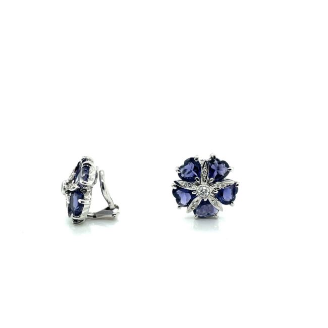 Metal Type: 14k White GoldSetting Type: Prong-Set and Bezel-SetFinish: High PolishMounting Type: Omega Clip BackingsStones: (5)10 Heart-Shaped TanzanitesDiamonds: (1)2 Round Brilliant Cut Diamonds in Center Bezels (0.10ct Total Weight), and (5)10 Prong-Set Round Brilliant Cut Diamonds (0.08ct Total Weight)Diamond Quality: G Color, VS ClaritySmyth SKU:?43534734