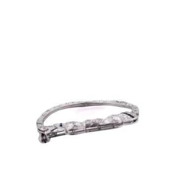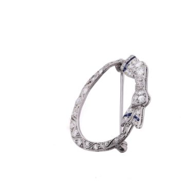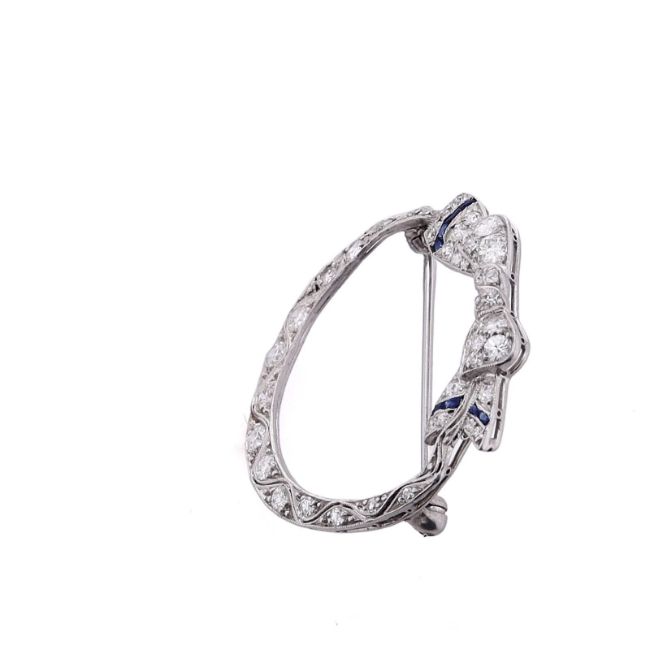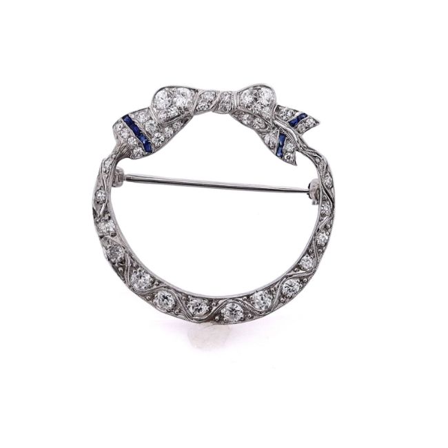 Bow Design Circle PinMetal Type: PlatinumSetting Type: Pave Diamonds and Channel-Set SapphiresFinish: High PolishStones: 8 Blue Synthetic SapphiresDiamonds: 39 Old European Cut Diamonds,?0.82ct Total WeightDiamond Quality: H Color, VS-SI ClaritySmyth SKU: 4220668-2