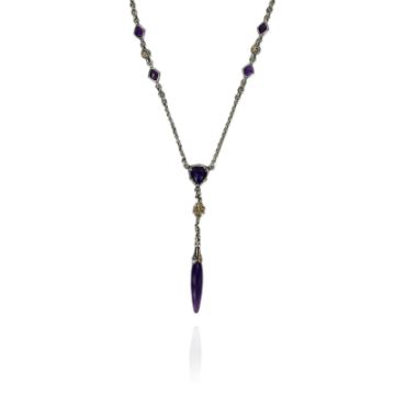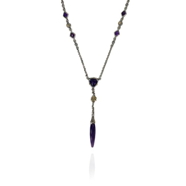 Amethyst Cross and Dagger Drop NecklaceMetal Type: 18k Yellow Gold and Sterling SilverSetting Type: Bezel-SetFinish: High PolishTrademark: Konstantino Anthos CollectionNecklace Length: 22Stones: 6 Faceted Purple AmethystsSmyth SKU: KOMK4788-671-22
