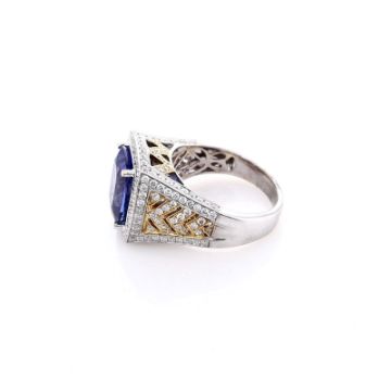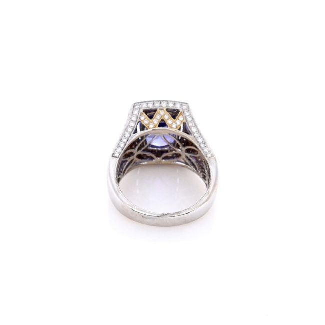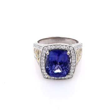 Metal Type: 18k White and Yellow GoldSetting Type: Prong-Set Tanzanite, Pave DiamondsFinish: High PolishRing Size: 8.5Stones: 1 Cushion Cut Purple Tanzanite,?5.88ct Total WeightDiamond Halo and ShankDiamonds: 198 Round Brilliant Cut Diamonds,?1.78ct Total WeightDiamond Quality: H Color, SI ClaritySmyth SKU- ATC-20247