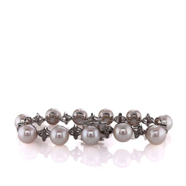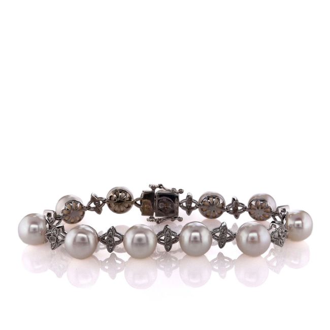 Metal Type: 14k White GoldSetting Type: Bezel-Set and Pave DiamondsFinish: High PolishWidth: 8.5mm - 9.0mm Pearls, 6.5mm Alternating Diamond LinksBracelet Length: 6.25Closure: Box Clasp With Two Figure 8 Safety ClaspsStones: 11 Button Akoya PearlsDiamonds: (3)33 Single Cut Diamonds, 0.16ct Total WeightDiamond Quality: H Color, SI - I1 ClaritySome Chips NotedSmyth SKU: BT-SM1000382-02