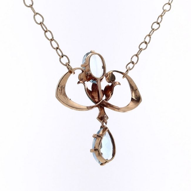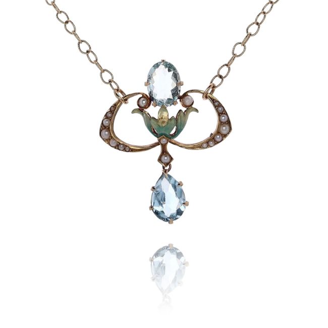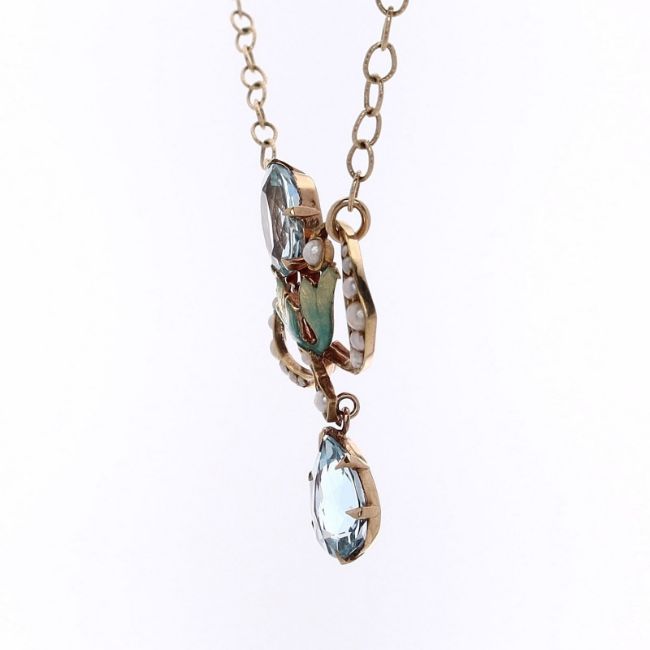 Metal Type: 14 Karat Yellow GoldSetting type: Prong-SetFinish: High PolishNecklace Length: 16Green Enamel CenterStones: 1 Oval (1.42ct) and 1 Pear Shaped Blue Aquamarine (1.66ct), 18 Seed PearlsSmyth SKU: 43490275