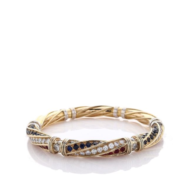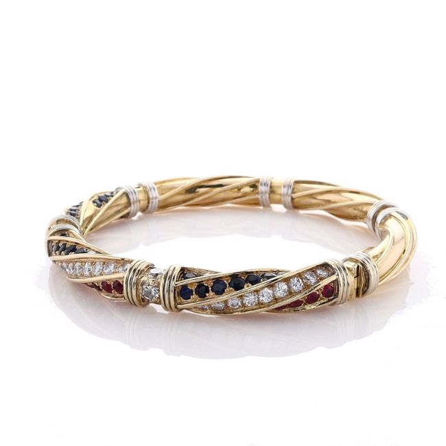 Metal Type: 18k Yellow and White GoldSetting Type: PaveFinish: High PolishClosure: Hidden ClaspStones: 39 Round Blue Sapphires (2.14ct Total Weight), and 39 Round Red Rubies (1.95ct Total Weight)Bar Diamonds: 30 Round Brilliant Cut Diamonds,?0.90ct Total WeightLink Diamonds: 6 Round Brilliant Cut Diamonds,?0.60ct Total WeightDiamond Quality: G-H Color, VS ClaritySmyth SKU: 4221497-1