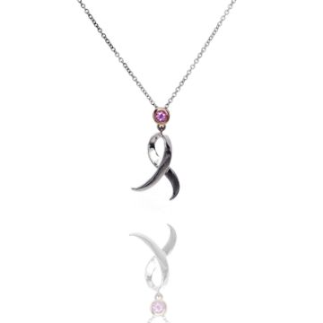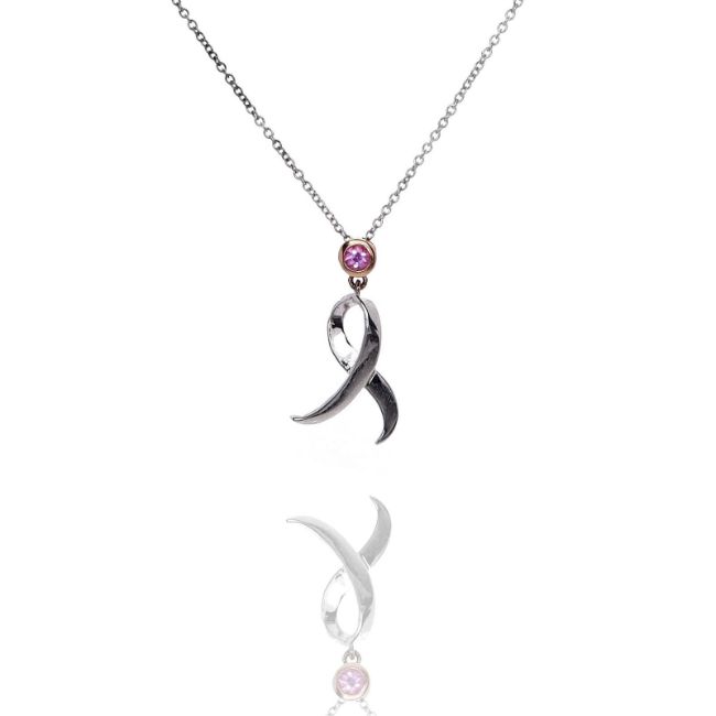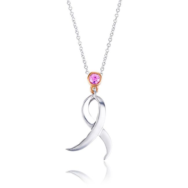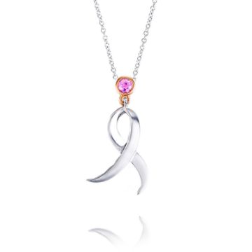 This beautiful pendant is crafted in sterling silver. It features a sparkling pink sapphire bezel set in 18 karat rose gold. The pendant showcases the signature Shining Strength ribbon.Metal Type: Sterling Silver and 18k Rose Gold Bezel SettingSetting Type: Bezel-SetFinish: High PolishChain Length: 18Stones: 1 Pink sapphire?Handcrafted by TacoriManufacturer Style Number: SN252P51
