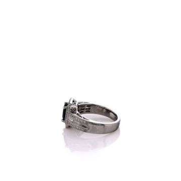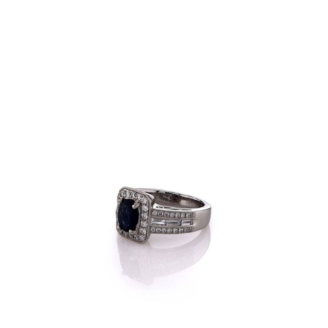 Metal Type: PlatinumSetting Type: Prong-Set Sapphire, Pave Round Brilliant Cut Diamonds, and Channel-Set Baguette Cut DiamondsFinish: High PolishWidth: 11.0mm Center, 5.5mm Shank Tapering To 3.5mmRing Size: 5.75Trademark: Simon G.Stones: 1 Blue Oval Sapphire, 1.13ct Total WeightDiamonds: 18 Round Brilliant Cut Diamonds in Halo, (14)28 Round Brilliant Cut Diamonds in Shank, and (3)6 Baguette Cut Diamonds in Shank, 0.65ct Total WeightDiamond Quality: G Color, VS ClaritySmyth SKU: 43264944