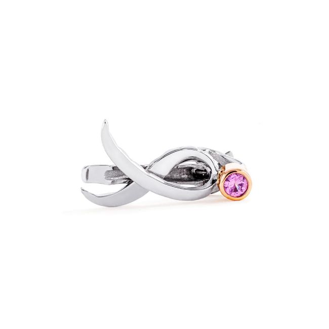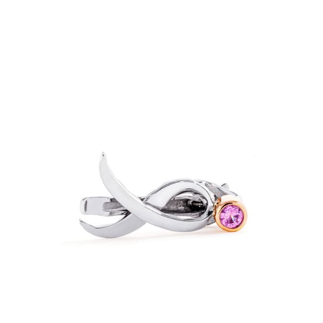 This tie bar is handcrafted in sterling silver. It features a pink sapphire bezel set in 18 karat rose gold and the signature Shining Strength ribbon.Metal Type: Sterling Silver and 18k Rose Gold Bezel SettingSetting Type: Bezel-SetFinish: High PolishStone: 1 Round Pink sapphireHandcrafted by TacoriStyle Number: MTB112P51
