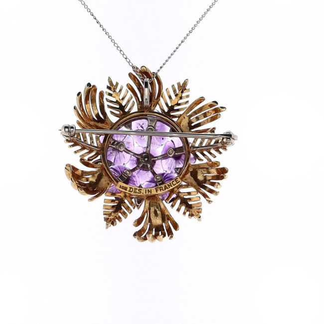 Metal Type: 18k Yellow GoldSetting Type: Prong-Set DiamondsFinish: High PolishWidth: 42mmStones: 6 Carved Purple Amethyst FlowersDiamonds: 11 Mixed Round Brilliant Cut and Square Cut Diamonds, 0.31ct Total WeightDiamond Quality: G Color, SI-I1 ClaritySmyth SKU: BT-SM1000909-01